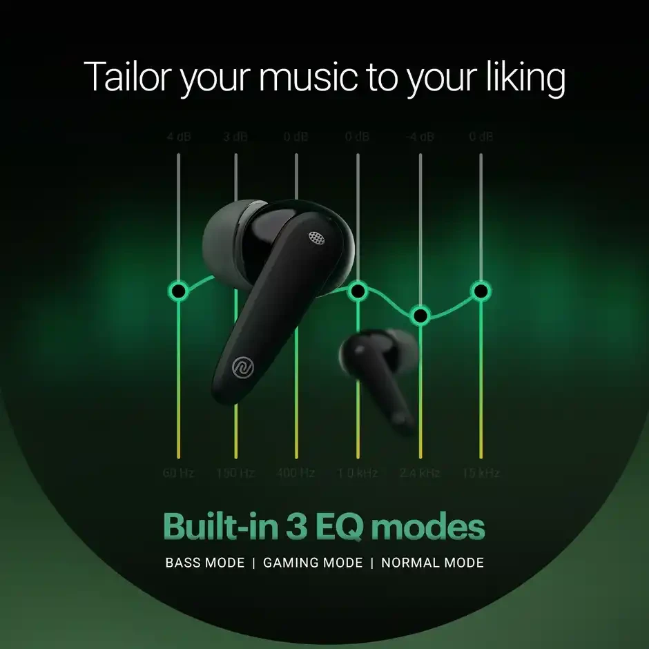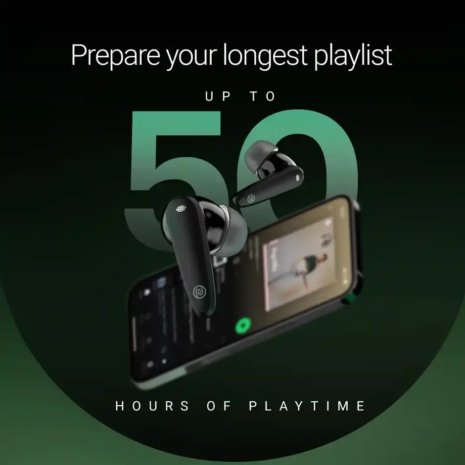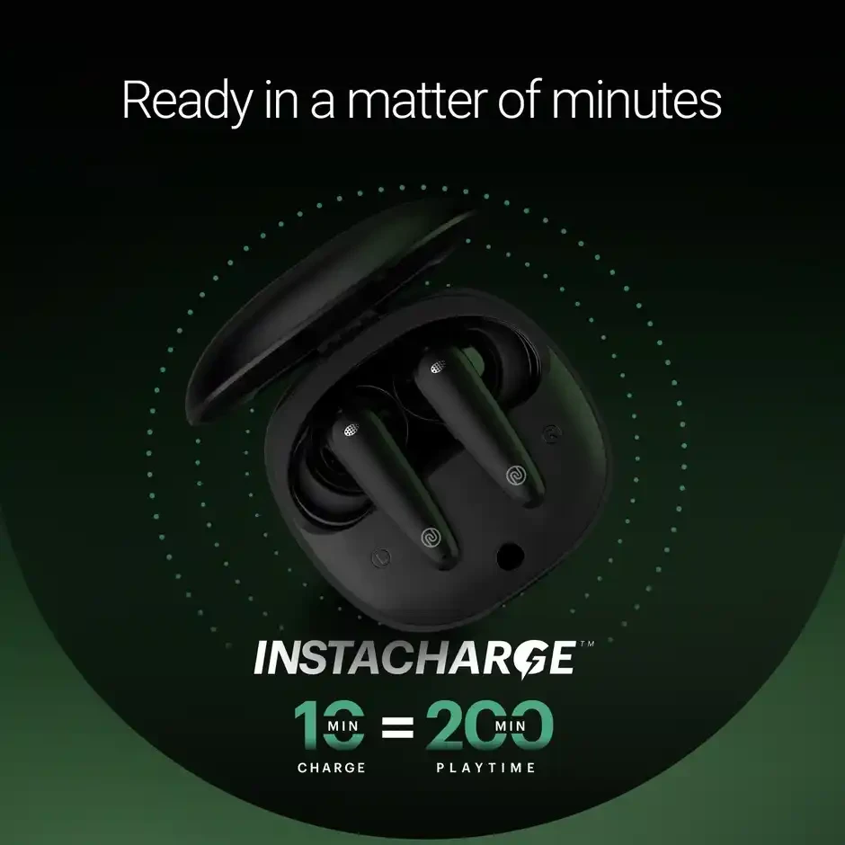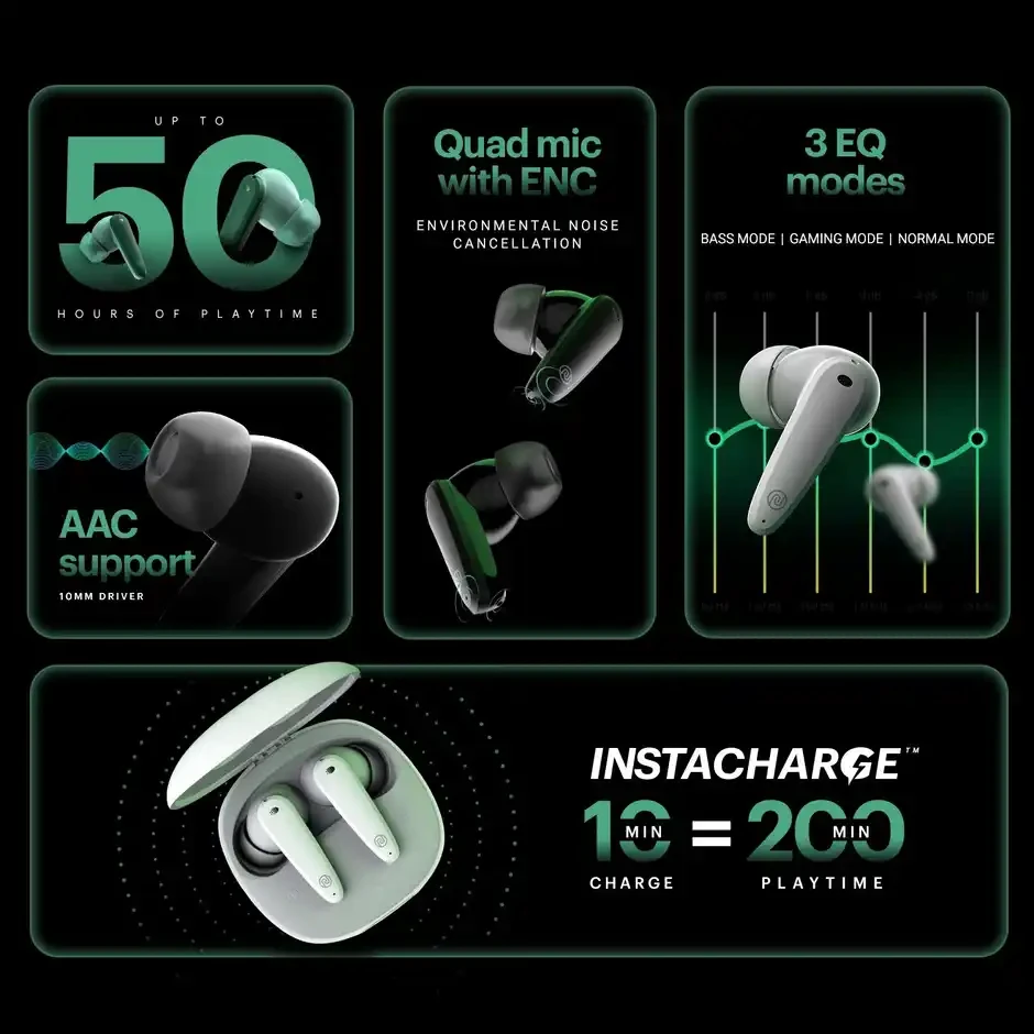 Up to 50 hours playtime, Quad mic with ENC, 3 EQ modes, AAC support, 10 mm driver, Instacharge